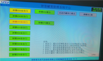 2、罐簾門的升降:可通知罐籠停止在某個中斷位置,且停穩(wěn)罐籠。根據(jù)控制需要上升或下降、停止罐簾門。手動操作罐簾門,按住按鍵1S,罐簾門動作,松開即可,罐籠門一鍵式操作,運(yùn)行6S后自動停止,如果需要高度更高(運(yùn)料情況下),再按一次上升按鍵即可上升到高位,感應(yīng)到上限位自動停止。